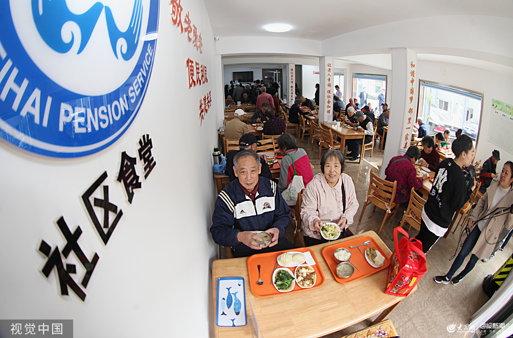 2019年10月23日,山東威海環(huán)翠區(qū)長(zhǎng)征社區(qū)社區(qū)食堂內(nèi),老人們正在食堂打飯,品嘗食堂的飯菜。