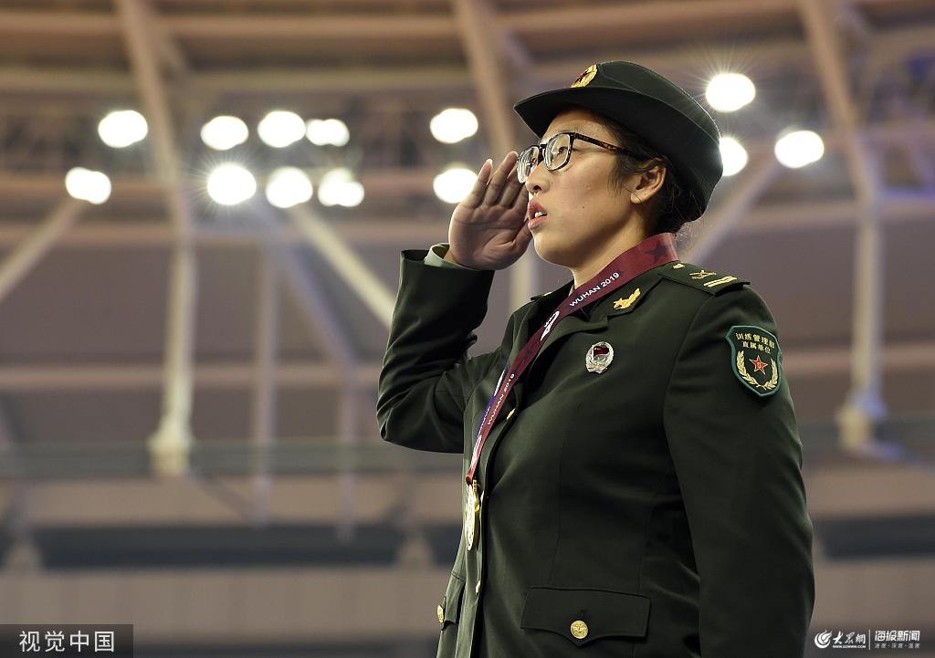 2019年10月24日,湖北武漢,2019第七屆世界軍人運動會女子鐵餅決賽賽況。圖為馮彬在頒獎儀式上。