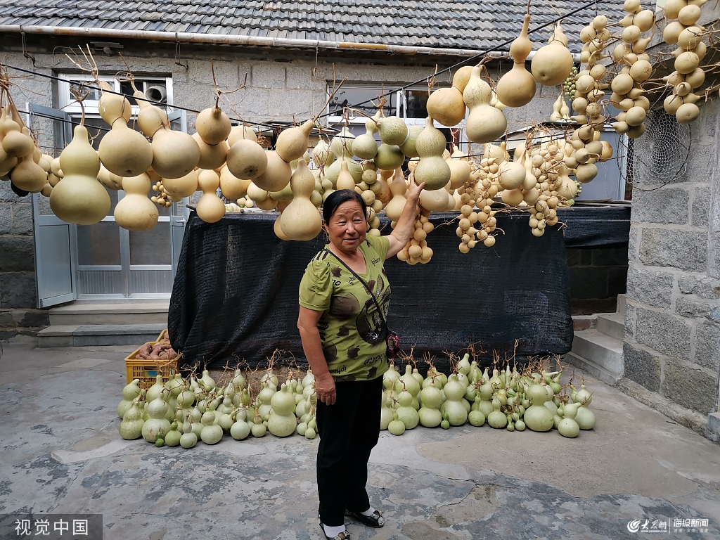 2019年10月24日,山東威海,文登區(qū)界石鎮(zhèn)有個(gè)梧桐庵村,據(jù)村志記載于姓家族清朝中期遷居至此,整個(gè)村落群山懷抱之中景色宜人如今被評(píng)為美麗鄉(xiāng)村示范村,每年超30萬(wàn)的游客讓66歲的王玲滋看到了商機(jī)。在她手中往年摘下來(lái)沒(méi)人要的葫蘆,在葫蘆上畫畫,葫蘆畫受到游客歡迎。