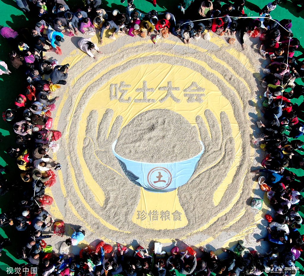 2019年10月26日,河南濟源舉辦王屋山全民“吃土大會”,近萬斤當?shù)鬲氂械耐琉x擺成手捧巨碗的畫面。圖片作者:DF/視覺中國