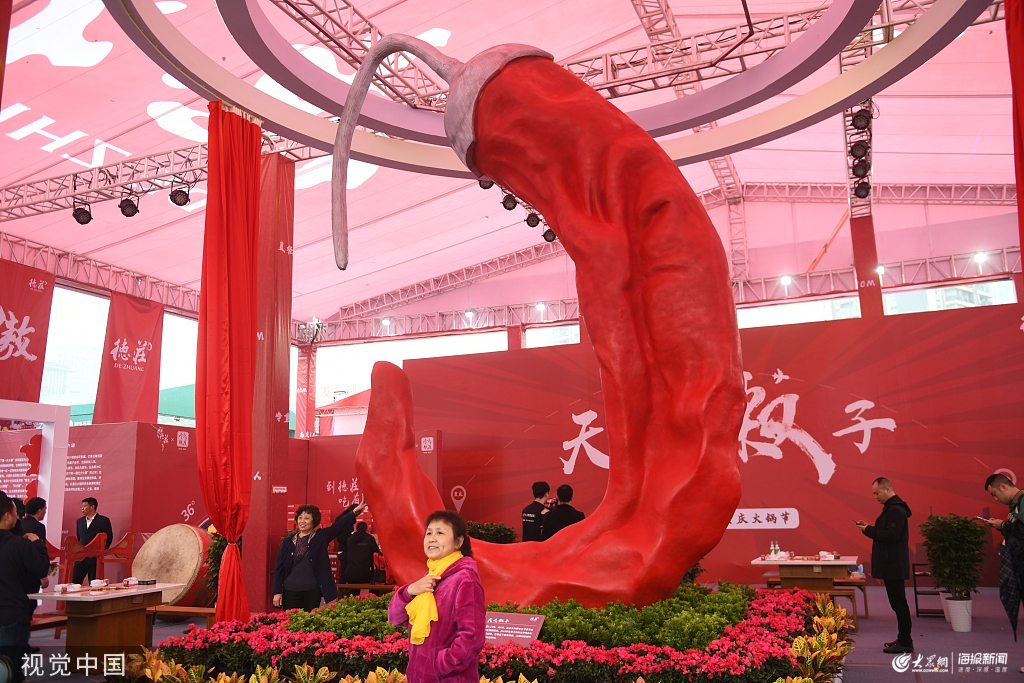 2019年10月25日,重慶,第十一屆中國(重慶)火鍋美食文化節(jié)在北濱路金源時(shí)代購物廣場(chǎng)盛大開幕,巨型辣椒雕塑“天之椒子”驚艷亮相。該辣椒雕塑高6米、重3.14噸,象征著紅火與熱情,由意大利藝術(shù)家朱紙創(chuàng)作,吸引眾人目光。圖片作者:渝慶/視覺中國