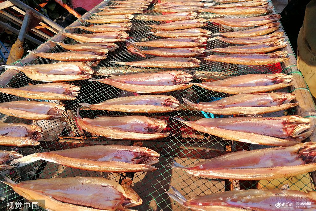 2019年10月,金秋時(shí)節(jié),山東青島西海岸新區(qū)積米崖漁港,一些漁民開始晾曬魚干。漁民們先將新鮮的海鮮魚清理干凈,用食鹽腌漬一個(gè)小時(shí)后左右,再用清水沖洗干凈,就可以平鋪在漁網(wǎng)上或者掛起來晾曬。晴好天氣晾曬的魚干干凈整潔,帶有海鮮特有的清香。晾曬魚干是過去漁民在海鮮沒法保鮮時(shí)創(chuàng)造出來的一種保存方法,現(xiàn)在成了漁民對(duì)過去生活的一種追憶,甜美的魚干也吸引了不少市民和游客前來購買。