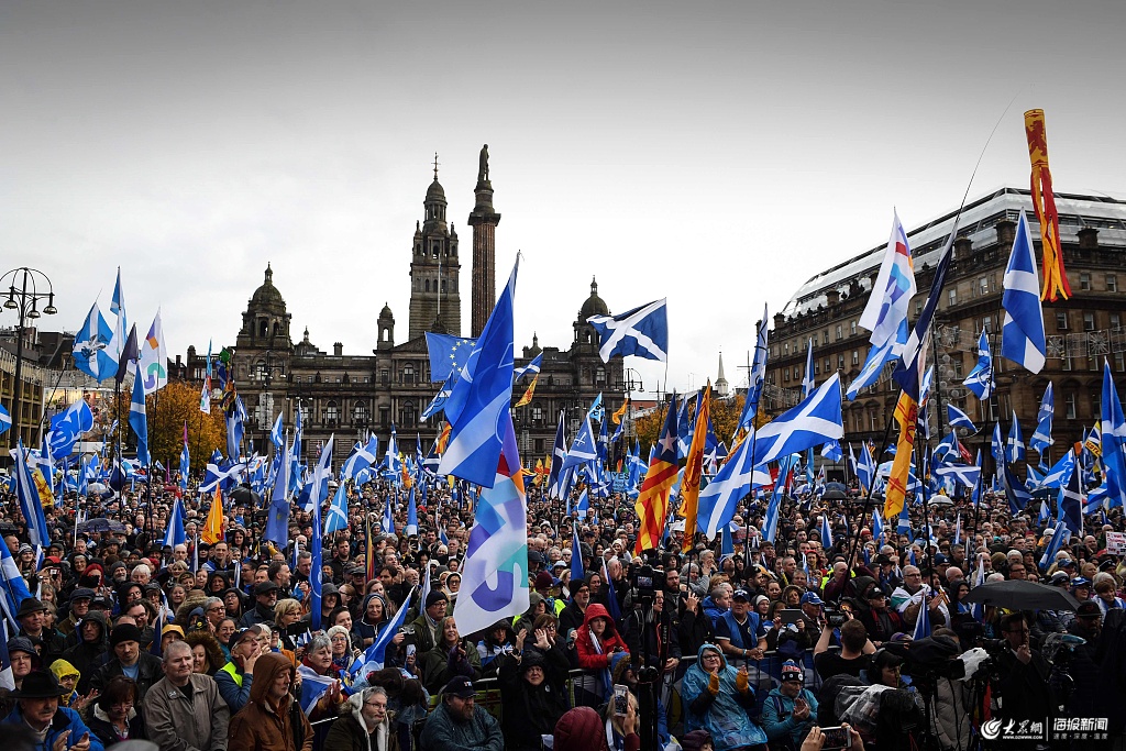 當(dāng)?shù)貢r(shí)間2019年11月2日,英國(guó)蘇格蘭格拉斯哥,數(shù)千人在英國(guó)蘇格蘭最大城市格拉斯哥舉行集會(huì),要求讓蘇格蘭成為獨(dú)立國(guó)家。蘇格蘭首席大臣、蘇格蘭民族黨(SNP)黨魁斯特金(Nicola Sturgeon)發(fā)表講話稱,獨(dú)立目標(biāo)已“近在咫尺”。