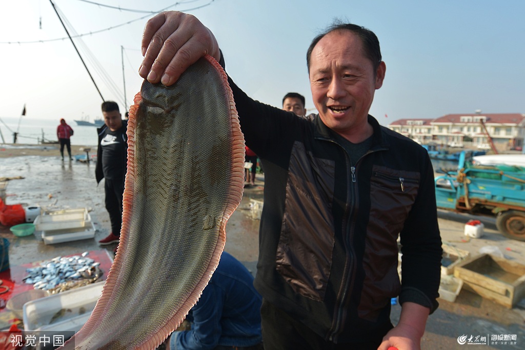 2019年11月5日,青島,秋捕時節(jié),紅島漁村下海捕撈的漁船陸續(xù)回港,漁民們在碼頭上將漁獲依次擺開就地銷售,樂在秋日豐收時。