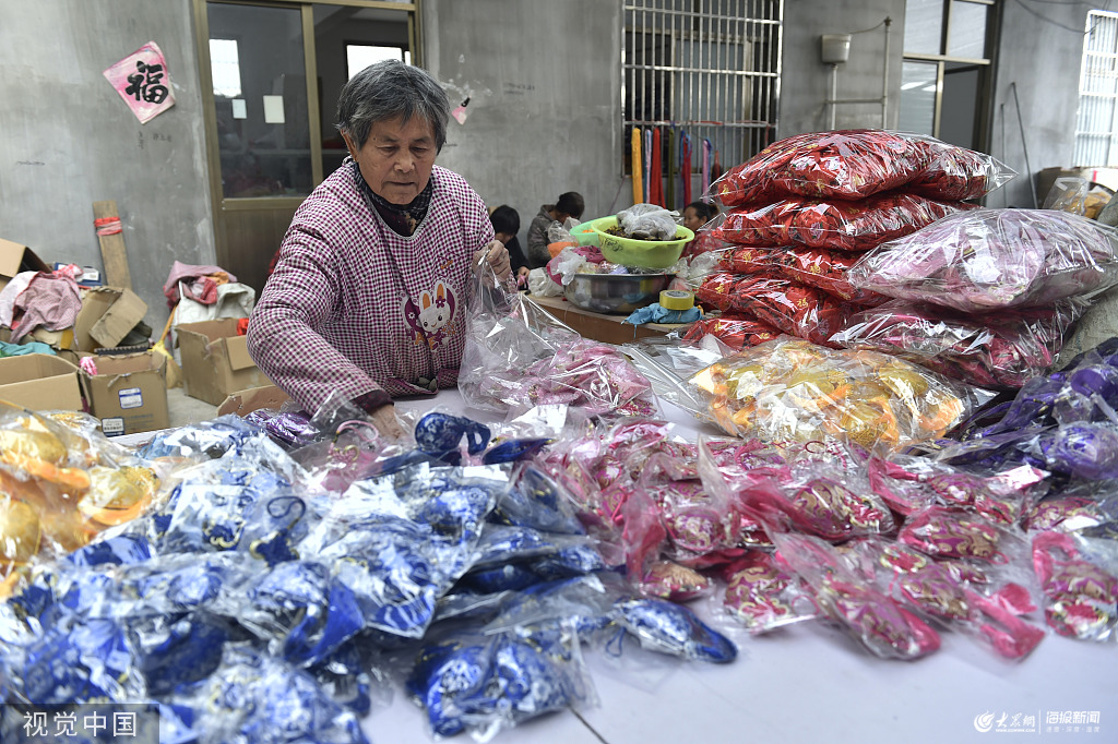 2019年11月8日,山東省棗莊市臺(tái)兒莊區(qū)澗頭集鎮(zhèn)后洪廟村貧困戶張夫英在村內(nèi)的薰衣草香包廠把香包裝袋準(zhǔn)備外運(yùn),備戰(zhàn)雙“十一”。
