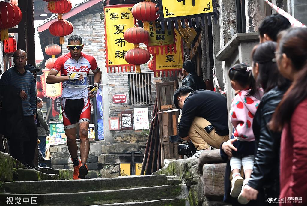 11月10日,2019中國(guó)重慶·榮昌“北體冠軍”國(guó)際劃騎跑鐵人三項(xiàng)公開賽開賽,吸引700余名中外選手參賽。本次活動(dòng)在賽事主題設(shè)計(jì)和路線選擇上,將當(dāng)?shù)孛袼罪L(fēng)情、地貌特色和非遺夏布等元素涵蓋其中,參加比賽的運(yùn)動(dòng)員需在6小時(shí)時(shí)間內(nèi),連續(xù)完成58公里山地自行車、12公里皮劃艇、8公里越野跑共計(jì)78公里賽程。圖為選手在古鎮(zhèn)中參加8公里越野跑。