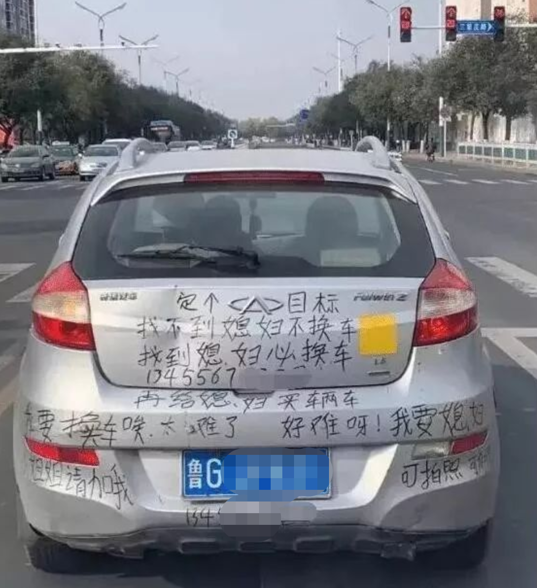 記者看到,小李的這輛奇瑞之所以走紅,是因?yàn)檐囄裁苊苈槁榈膸仔凶謱?shí)在是太吸睛了:“定個(gè)小目標(biāo),找不到媳婦不換車,找到媳婦必?fù)Q車,再給媳婦買輛車。我要換車,唉,太難了,好難呀!我要媳婦,姐姐請加我,可拍照,可加微!毙±钸留下了電話號(hào)碼,表態(tài)歡迎拍照轉(zhuǎn)發(fā)。