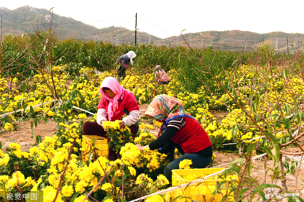 2019年11月12日,山東威海榮成市石島管理區(qū)寧津街道留村一家中藥材種植專業(yè)合作社基地,間隔種在文冠果樹苗里的金黃色菊花盛開,村民們正穿梭在盛開的菊花叢中,忙著采摘菊花。