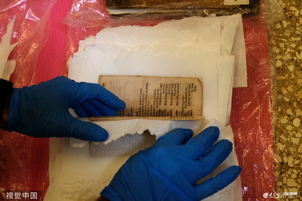 當(dāng)?shù)貢r(shí)間2019年11月16日,意大利威尼斯,當(dāng)?shù)卦庥鰢?yán)重洪災(zāi),志愿者搶救貝內(nèi)代托·馬爾切洛音樂學(xué)院( music conservatory Benedetto Marcello)中歌劇家貝內(nèi)代托·馬爾切洛的手稿。