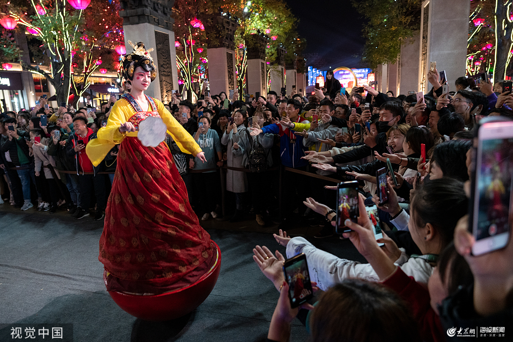 2019年11月12日,西安,大唐不夜城景區(qū)的“真人不倒翁”吸引眾多游客前來拍照打卡。