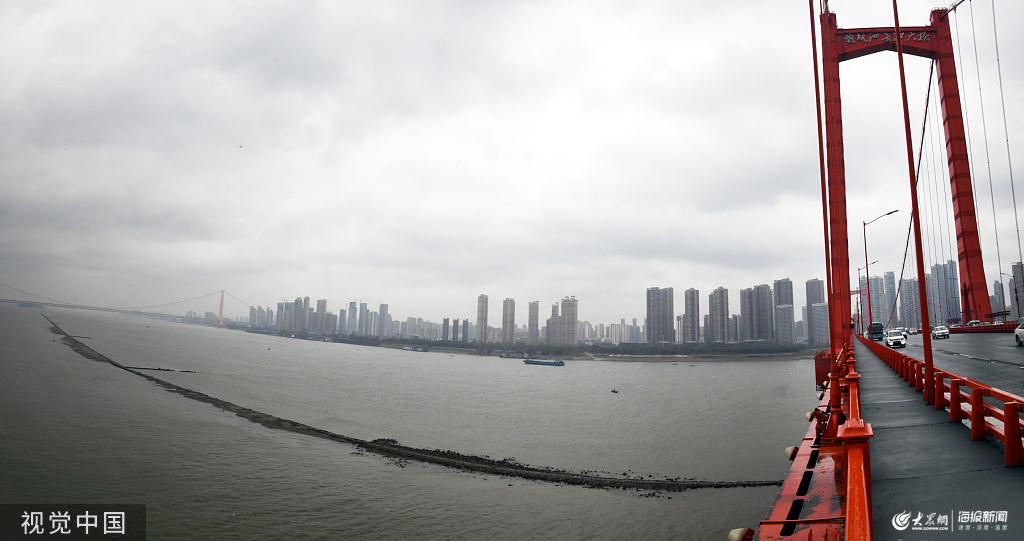 長江武漢段鸚鵡洲長江大橋中間橋墩處,從長江下游往上游方向,江面中心出現(xiàn)了一條細長“道路”。