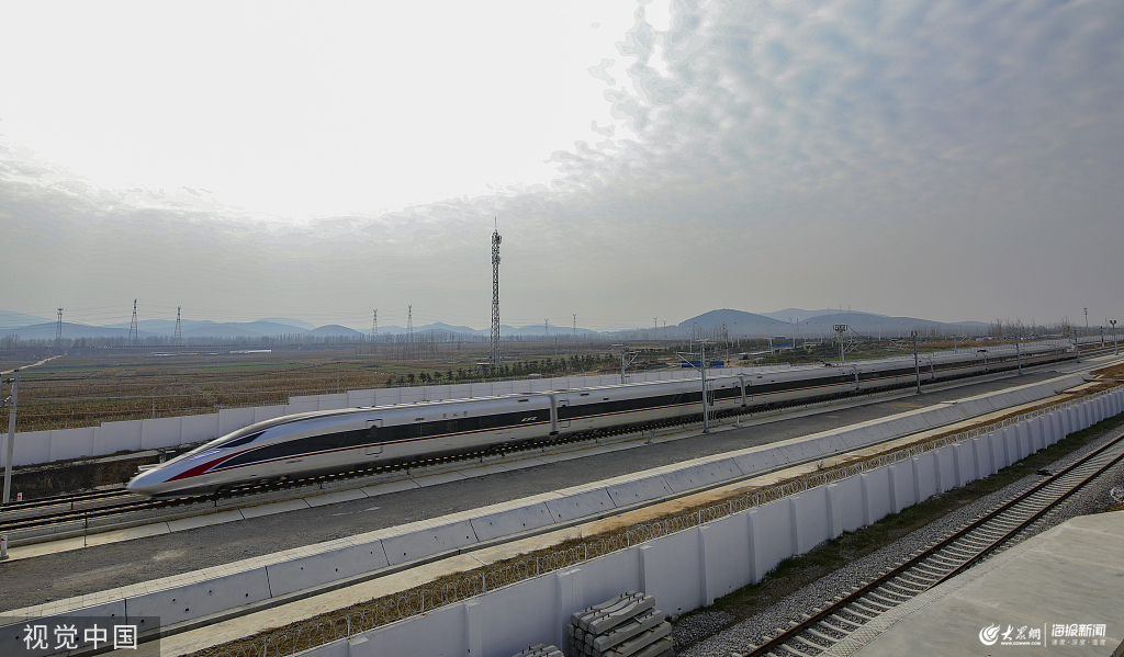 山東臨沂,日蘭高鐵的首段線路,即魯南(日蘭)高速鐵路日照-臨沂-曲阜段線路將率先開通運(yùn)營(yíng),復(fù)興號(hào)列車駛經(jīng)平邑縣蒙山站。