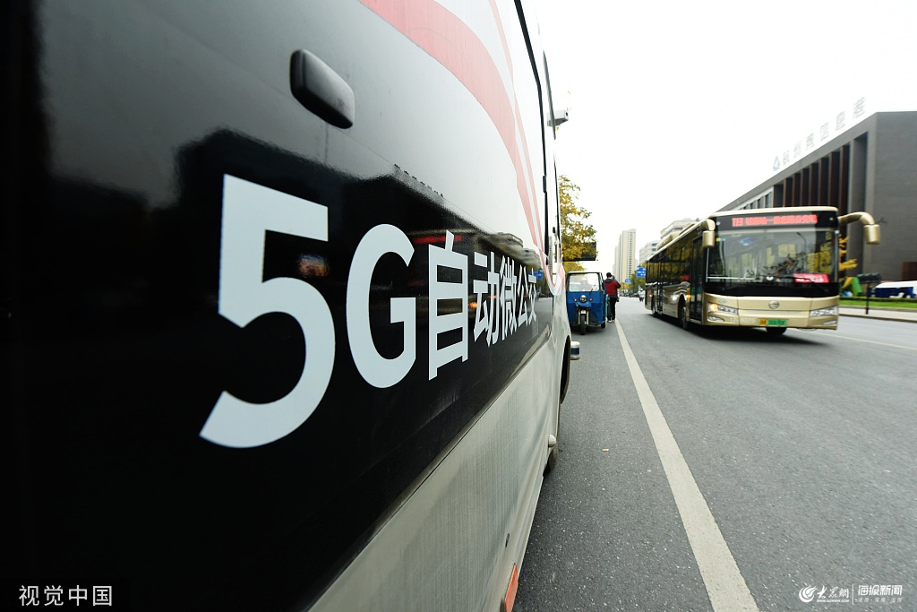 在杭州市蕭山區(qū)道路上,一輛公交車從5G無人駕駛微公交邊上駛過。