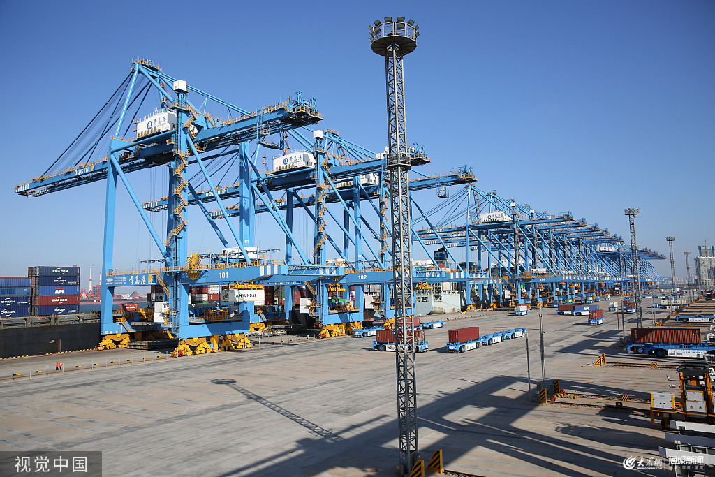 青島港全自動(dòng)化碼頭(二期)投產(chǎn)運(yùn)營(yíng),一艘貨輪在裝卸貨物。