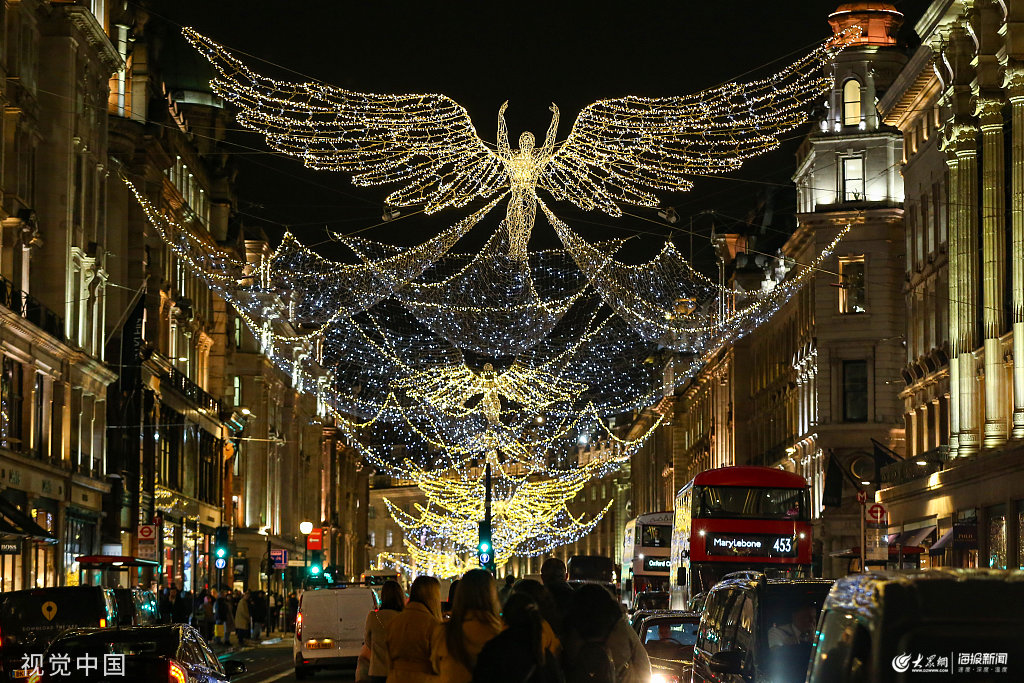 圣誕節(jié)臨近 倫敦市中心圣誕彩燈溫暖冬夜。