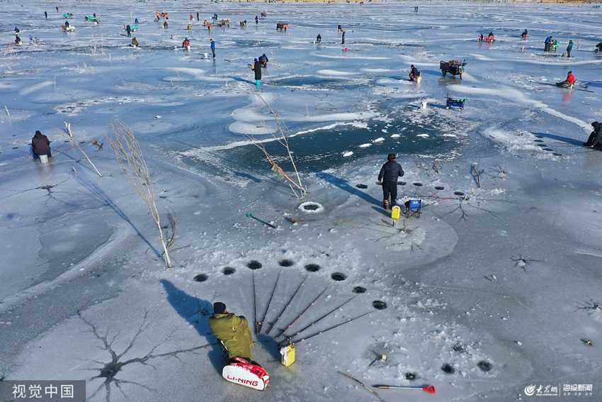 2019年12月7日,北京,大雪節(jié)氣,在延慶海坨山下,附近的垂釣愛好者紛紛來到媯河,盡情享受冰釣的樂趣。據(jù)垂釣愛好者介紹,這里里凍冰的厚度已經(jīng)超過了十公分。