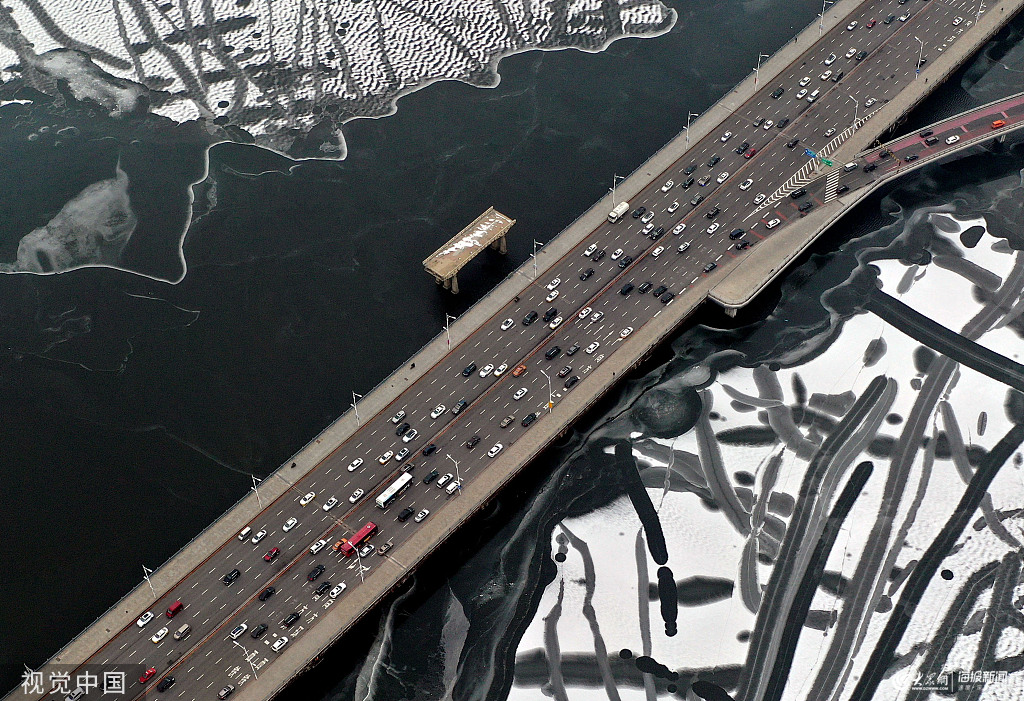 2019年12月8日,沈陽(yáng)。大雪時(shí)節(jié),渾河結(jié)冰,機(jī)動(dòng)車(chē)穿梭于冰河橋上,頗為壯觀。