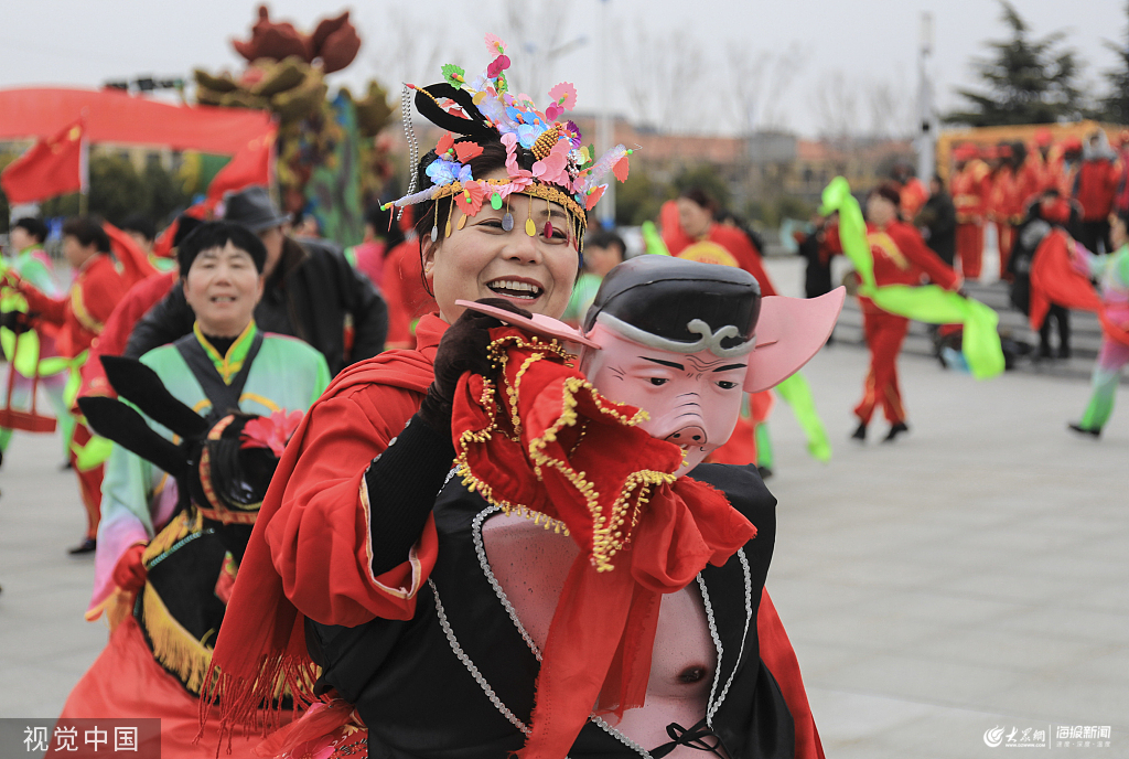 2019年2月8日,山東臨沂,居民在國(guó)際海棠藝術(shù)中心進(jìn)行傳統(tǒng)秧歌表演。