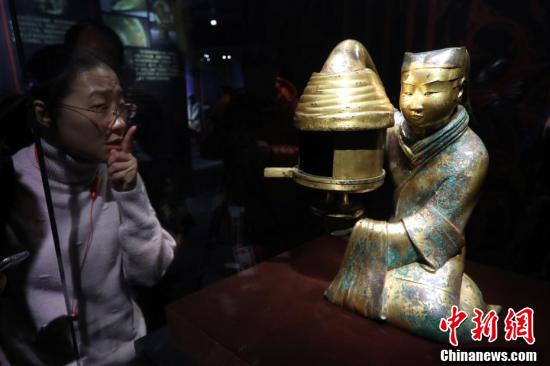 12月20日,展出的長信宮燈(中山王后竇綰墓出土)吸引觀眾的目光。當(dāng)日,“兄弟王——從滿城漢墓到大云山漢墓”漢代文物展在南京博物院正式開展。展覽以西漢滿城中山王陵、大云山江都王陵的出土文物為中心,展現(xiàn)西漢景帝至武帝時(shí)期諸侯王的文化、生活狀態(tài)以及江都王劉非、中山王劉勝兩人的兄弟、宗親等關(guān)系。展覽分為“諸侯王權(quán)”“王室儀軌”“事死如生”“永生之夢”四個(gè)部分,呈現(xiàn)漢文明中的先進(jìn)文化。 中新社記者 泱波 攝