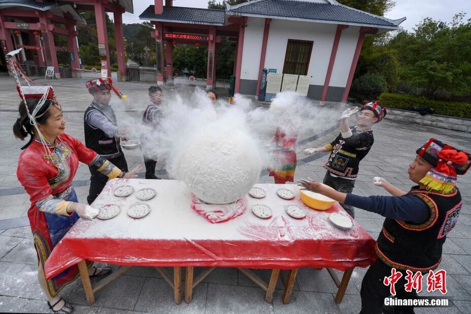 12月20日,畬族民眾正在制作“冬節(jié)丸”。當(dāng)日,湖南汝城九龍江的畬族青年男女們制作了一個直徑1米的“冬節(jié)丸”,以此迎接冬至。 中新社記者 楊華峰 攝