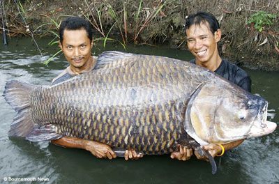 泰國漁民基克(右)捕獲的這只暹羅巨鯉個頭大得驚人。(《每日郵報》圖片)