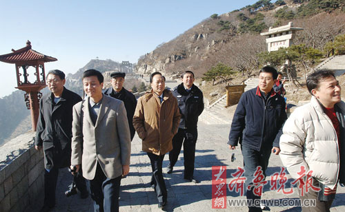 南線考察采風(fēng)團的媒體老總和相關(guān)負責(zé)人,28日登上了五岳之尊的泰山,“一覽眾山小”。天公作美,岱頂之上,天空湛藍,陽光燦爛,泰山風(fēng)光一覽無余。泰山石敢當(dāng)、碧霞元君祠、封禪文化、摩崖石刻書法……泰山深厚的文化底蘊,讓老總們感嘆不虛此行。在天街、拱北石、玉皇頂?shù)柔讽數(shù)臉?biāo)志性景點,老總們拍照留念。江西日報副總編輯王暉說,以前來過山東,但一直沒有機會登泰山,這次了卻了一個心愿。