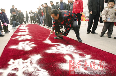 “賀齊魯晚報(bào)創(chuàng)刊二十周年!齊魯青未了,晚報(bào)達(dá)民意!保玻慈丈衔,在水城明珠劇場前的廣場上,聊城民間藝人魏翌,F(xiàn)場表演了他的沙書絕活,21個(gè)沙書字一氣呵成,在十米紅布上排列得整整齊齊。沙書寫完,沙盤的“沙子”恰好全部用光。魏翌海告訴記者,在布上走一遍是為了測量字間距,而旋轉(zhuǎn)是為提精神,他手里的這盤“沙”由6斤玉米糝兒和2斤鹽調(diào)配而成,為了現(xiàn)場表演能夠成功,他提前進(jìn)行了精心準(zhǔn)備。